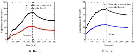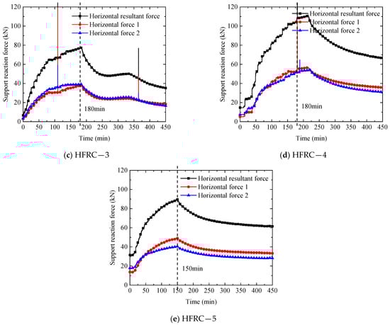 - The horizontal support reaction force was affected by the preload and the fire condition, which shows the same trend as the furnace temperature. As the furnace temperature rises, the horizontal support reaction force increases.