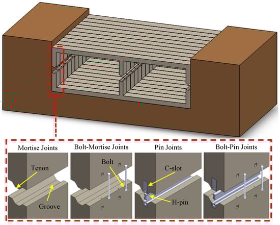 The structural form and the stress condition of fabricated frame tunnels are significantly different from those of circular tunnels, and rectangular fabricated tunnels have large spans and heavy single-piece components. Therefore, the joints of rectangular tunnels require better mechanical properties. The types of annular joints of fabricated frame tunnels can be summarized as mortise joints, steel sleeve joints, and steel box joints. Among them, mortise joints are composed of tenons and grooves, which produce a certain occlusal effect under the action of axial pressure. The concave–convex occlusal structure can not only resist shearing force but also increase the overall rigidity of the structural joint. It is a relatively common assembly method at present. This study mainly discusses the mechanical properties of four types of fabricated frame tunnel joints, including MJ, BMJ, PJ, and BPJ, at room temperature and under fire conditions, as shown in Figure 1.