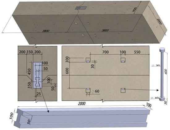 The numerical simulation model of the fabricated frame tunnel joint is 3800 mm long, 2000 mm wide, and 900 mm thick. The detailed dimensions of the BPJ are shown in Figure 2.