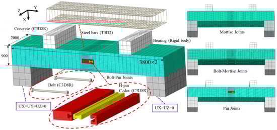 Different element types are used in the numerical simulation. The 8-node linear heat transfer brick elements (DC3D8) and 2-node heat transfer link elements (DC1D2) can effectively reflect the heat transfer. The 8-node 6-facet reduced integral elements (C3D8R) are more accurate in solving the displacement, and the analysis accuracy will not be affected when the mesh is deformed. The 2-node linear 3-D truss elements (T3D2) can effectively reflect the change of the axial stress of the element and is suitable for simulating steel bar. Therefore, in the process of the temperature field calculation, DC3D8 is used to simulate the concrete joints, bolts, H-pin, and C-slot. The steel bars are modeled by DC1D2. In the process of the force-field calculation, the steel bars are modeled using T3D2, and the other parts adopt C3D8R. The meshing of the joint is shown in Figure 3.
