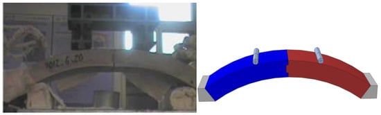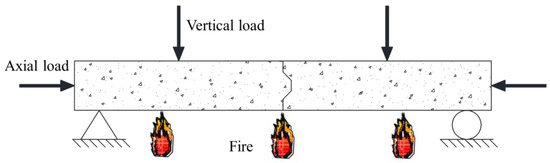 Tunnels are narrow and closed relative to aboveground structures, and continuous high temperature in tunnels during a fire causes serious damage to the tunnel lining. For example, in 1996, the tunnel lining was severely damaged in the Channel Tunnel between England and France in a fire, and the most serious damage was that the spalling depth of the original 45 cm thick lining segment concrete reached 40 cm [1,2]. In 1999, the Mont Blanc fire at the France–Italy border caused local concrete peeling of the tunnel vault [3]. In 2011, a large amount of concrete on the side and top of the tunnel spalled off in the fire of the Xinqidaoliang Tunnel in China [4,5]. In 2019, the Limaoling Tunnel facilities were severely damaged by scorching the tunnel vault and detaching concrete blocks in a fire. After fire exposure, the damage to a tunnel greatly reduces the bearing capacity of the tunnel lining. Therefore, it is of great significance to carry out research on the bearing capacity of tunnel structures under fire exposure for tunnel fire prevention and disaster resistance.