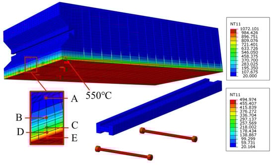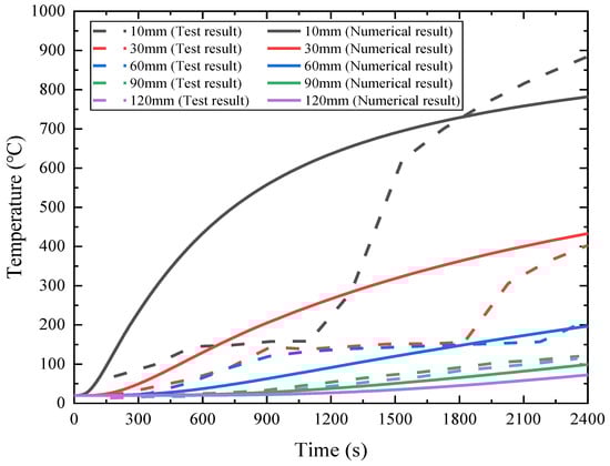 The temperature time histories of different temperature measurement points of a joint are obtained through heat transfer analysis. Figure 6 shows the numerical and experimental comparison results of the temperature time histories of the joint under fire exposure. As shown in Figure 6, the change trends of the experimental and numerical results of the temperature measuring points at different positions are basically the same. The time–temperature curve of the measuring points 10 mm and 30 mm away from the surface on fire exhibit a noticeable prolonged plateau at a temperature, but the numerical results have no such plateaus. This phenomenon could not be accurately simulated due to the evaporation of water, which removes the heat of the lining concrete. As the water in the fire area evaporates, the temperature rises rapidly, and the simulated temperature is getting closer to the measured temperature. At 2400 s, the temperature error between the numerical value and the test result is small, and each measuring point reaches the maximum temperature at this time. The maximum temperature of concrete structures under fire is a crucial factor affecting the bearing capacity. Therefore, the thermal parameters and heat transfer analysis modeling of concrete and steel in this study can reflect the effect of fire on structural performance.