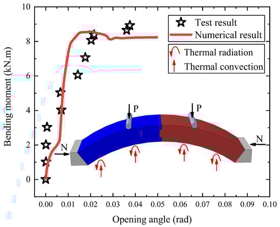 To verify the correctness of the flexural bearing capacity of the model under fire, the flexural bearing capacity test and numerical results of specimen RCJ3 under fire were compared and analyzed. Figure 7 shows the numerical and experimental comparison results of the M-θ curves of specimen RCJ3. As shown in Figure 7, the vertical load resistance capacity measured in the test is 9.04 kN·m, and the vertical load resistance capacity measured in the numerical simulation model is 8.56 kN·m. The error between the simulation and the test value is only 5.31%, as shown in Table 4. It can be seen that the test values of the bending moment and the opening angle of the segment are basically distributed around the curve of the numerical simulation results. Therefore, the numerical modeling method used in this study to obtain the bearing capacity of the joint under fire is reliable.