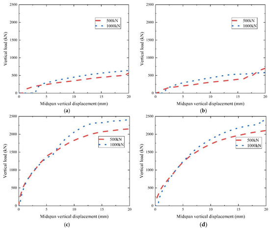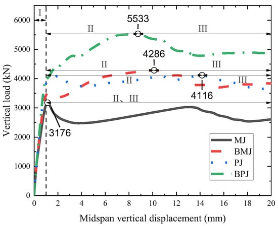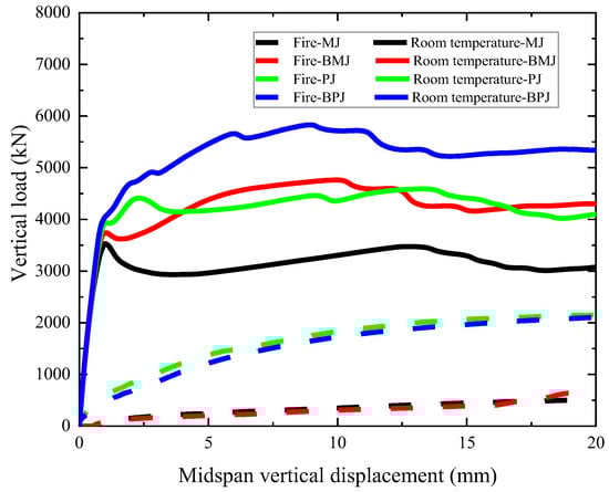 Figure 15 shows that the initial axial force changed from 500 kN to 1000 kN, the vertical peak load of the MJ changed from 565 kN to 642 kN, the vertical peak load of the BMJ changed from 703 kN to 581 kN, and the flexural bearing capacity–displacement load curves of the MJ and BMJ did not change much. The vertical peak loads of the PJ and BPJ increased from 2150 kN to 2410 kN and 2105 kN to 2433 kN, respectively. It can be seen that increasing the initial axial force is beneficial for improving the flexural bearing capacity of the PJ and BPJ under fire. However, it does not significantly improve the flexural bearing capacity of the PJ and BPJ.