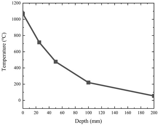 According to the direction of the lining thickness, the temperature measuring points of A~E are selected, and the distance from them to the fire receiving surface is 0~200 mm. The trend curve of the temperature at different measuring points with time is obtained, as shown in Figure 10. When exposed to fire for 120 min, at a distance of 25 mm from the inner surface of the tunnel lining, the temperature is weakened to approximately 715 °C. At a distance of 50 mm from the inner surface of the tunnel lining, the temperature is weakened to approximately 477 °C. At a distance of 100 mm from the inner surface of the tunnel lining, the temperature is weakened to approximately 220 °C, and at a position of 200 mm, the temperature is weakened to approximately 55 °C. Figure 11 shows the temperatures of different measuring points when the joint is exposed to fire for 120 min. It can be seen from the figure that the temperature on the joint decreases rapidly with increasing distance from the inner surface of the tunnel. At a depth of 0 mm to 50 mm from the inner surface of the tunnel, the rate of temperature drop is linear, while at a depth of 50 mm to 200 mm from the inner surface of the tunnel, the rate of temperature drop gradually decreases.
