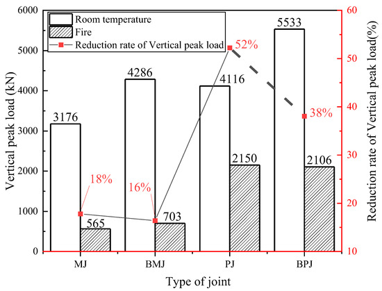From Figure 13, when the fire lasts for 120 min, the ratio η reaches 18% due to the absence of connecting components in the MJ. Since the bolt temperature reaches 495 °C, the connection function has been lost after 120 min of fire, and the flexural capacity of BMJ decreases the most, and its ratio η is 16%. The ratio η of the PJ and BPJ under 120 min of fire exposure is significantly higher than that of the other two joints, 52% and 38%, respectively. Because the temperature of the pin does not increase significantly after 120 min of fire, the connection of the pin still has a certain connection function. The decrease degree of the vertical peak load of the MJ and BMJ is greater than that of the PJ and BPJ joints. It can be seen that the results of the ratio η of the four joints correspond to the results of the temperature field analysis.