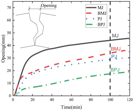 Structural deformation is the primary reference for judging the limited state of a structure. In this study, the opening outside of the joint is used as the index to judge structural deformation. To compare the deformation characteristics of the four types of joints under fire, a 500 kN axial force and the standard European HC curve of 120 min are applied to the joint. The opening of the upper edge of the joint is extracted, and the relationship curve of the opening with time is obtained, as shown in Figure 14. Figure 14 shows that the openings of the four types of joints increase rapidly from 0 to 10 min and then slowly increase. Among them, the MJ and BMJ have basically the same variation in the opening from 0 to 5 min, and the change rate of the opening is greater than that of the other two joints. Under a fire of 120 min, the openings of the MJ, BMJ, PJ, and BPJ are 46 mm, 37 mm, 30 mm, and 19 mm, respectively. During the 120 min fire, the opening of the BPJ is much smaller than that of the other three joints. The combined action of the pin and bolts and tongue groove can effectively reduce the opening of the joint.