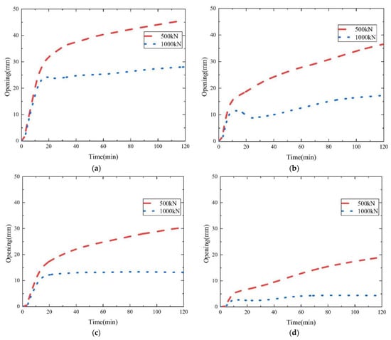 Figure 16 shows that the size of the initial axial force will significantly impact the opening of the joint. When the initial axial force is changed from 500 kN to 1000 kN, after 120 min of fire, the opening of the MJ is reduced from 46 mm to 28 mm, the opening of the BMJ is reduced from 37 mm to 17 mm, the opening of the PJ is reduced from 30 mm to 13 mm, and the opening of the BPJ is reduced from 19 mm to 4 mm. The openings of the four joints are reduced after increasing the initial axial force.
