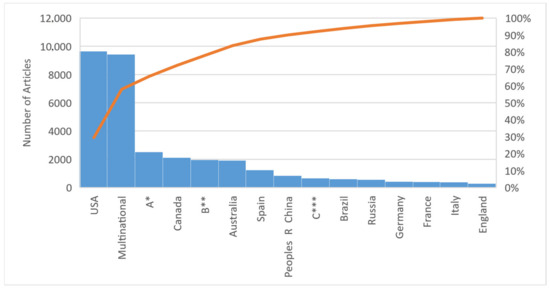 Number of articles by country. A * for countries which have publications between 500 and 999, B ** for countries which have publications between 100 and 499, and C *** for other countries having fewer than 100 publications.