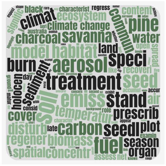 In any textual analysis, the repetitions of words may not mean the importance of those words. As the reasons are explained in the sections above, various rules were applied to index words in studies dealing with forest fires and the importance levels of the indexed words were calculated using the inverse document frequency method as in Equation (2). Figure 3 presents the summary of indexed words in a word cloud scheme and the sizes of words are sized according to their importance weights.