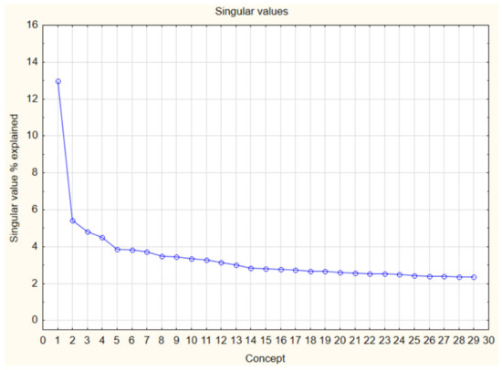 This approach is also referred to as concept extraction. Figure 4 shows that the indexed words can be analyzed according to their importance weights in twenty-nine concepts. As can be seen from the Figure 4, each concept has a different weight. While the first concept weighs considerably more than the others, the second, third, and fourth concepts have relatively greater weights than the others. In addition to these, the weights of the remaining concepts are both decreasing and are very close to each other.