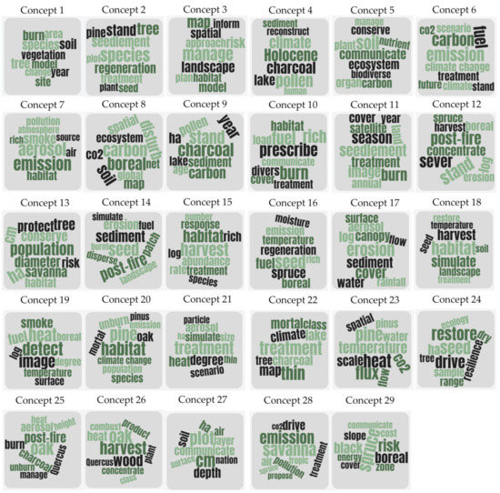 All the abstracts are in English, the indexing language was set as English. The maximum number of words to be chosen was determined as 1000. The minimum frequency of the occurrence of words in a single document to be selected was 3%. Stop words, synonyms, and phrases were defined according to “forest fire” concepts. The stop word list contains words that will not be included in the analysis (e.g., am, is, are, wildfire, forest fire, Elsevier, author, etc.). These words may appear in abstracts, but it is assumed that they do not contain information about the importance of the subject studied. Therefore, it was determined not to be indexed so as to be excluded from the analysis. The synonyms list contains words that should not be evaluated separately (conclude, conclusion; analysis, analyze, analyses; response, responded; south, southern, etc.). The phrase list contains words that should be evaluated as a single word (climate change, remote sensor, etc.).