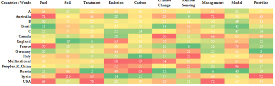 The second most important word was “fuel”. Contrary to the word “soil”, the word “fuel” can be said to be a subject whose importance has increased over the years with a slightly increasing trend after the year 2000. What is meant by the word “fuel” should generally be perceived as combustible organic materials (such as dried leaves and dried wood residues) accumulated in forested areas. The word may encompass research that combines some sort of accumulated biomass and probable wildfire research. It is observed that the USA, Australia, and France are the countries that attach the most importance to research on the relationship of combustible material accumulated in forest areas with forest fires. On the other hand, studies originating in Brazil, Germany, and group C countries gave less importance than the others.