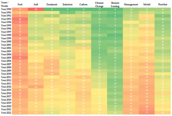Although the words examined in this section are primarily selected from the first cluster containing the most important words in Table 6, it will not be possible to analyze all the indexed words one by one. Some indexed words that are not among the most important cluster may have a possible positive trend and need to be analyzed. An example of these words is “remote sensing”. Remote sensing is an issue that includes the use of various technologies, which have an important place in early fire intervention.