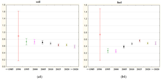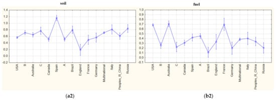 (a1) mean importance weights of the indexed word “soil” for five-year periods; (b1) mean importance weights of the indexed word “fuel” for five-year periods; (a2) mean importance weights of the indexed word “soil” via countries; (b2) mean importance weights of the indexed word “fuel” via countries.