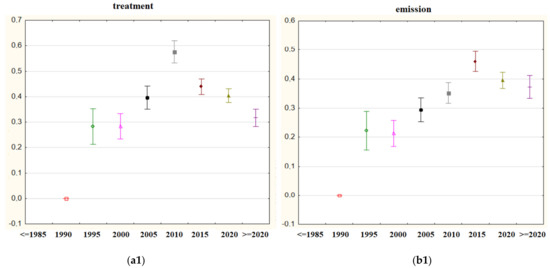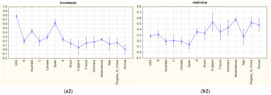 (a1) mean importance weights of the indexed word “treatment” for five-year periods; (b1) mean importance weights of the indexed word “emission” for five-year periods; (a2) mean importance weights of the indexed word “treatment” via countries; (b2) mean importance weights of the indexed word “emission” via countries.