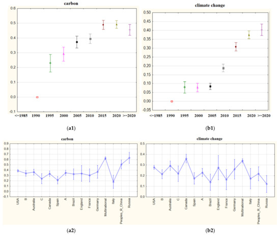 (a1) mean importance weights of the indexed word “carbon” for five-year periods; (b1) mean importance weights of the indexed term “climate change” for five-year periods; (a2) mean importance weights of the indexed word “carbon” via countries; (b2) mean importance weights of the indexed term “climate change” via countries.