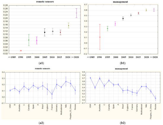 (a1) mean importance weights of the indexed term “remote sensors” for five-year periods; (b1) mean importance weights of the indexed word “management” for five-year periods; (a2) mean importance weights of the indexed term “remote sensors” via countries; (b2) mean importance weights of the indexed word “management” via countries.