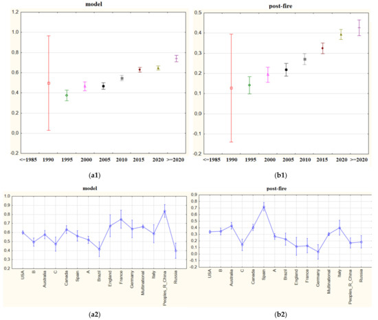 Especially after the Kyoto protocol, which entered into force on 16 February 2015, many countries gave importance to climate change in many different areas. As can be seen in Figure 10(b1), it can be observed that the importance given to climate change has increased significantly in studies on forest fires, especially after 2005. As can be seen from the figure, the positive direction in the trend has become sharply evident and it has not been revealed to have lost its importance yet. It is likely that forest fires and climate change linkage (for pre-fire and post-fire situations) will continue to be investigated in the following periods as well. Research from Canada and multinational addresses gave the greatest importance to this issue; conversely, studies from Russia gave the least importance.