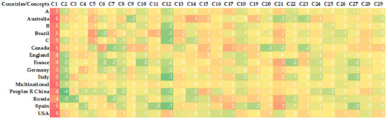 In Figure 13, the differences in the average importance weight of each concept by country are shown as a heatmap. Table 8 and Figure 5 contained information about which topics the concepts covered. In Figure 13, it can be easily observed whether a particular country attaches more importance to any concept than others. For example, while Concept 12, which probably focused on studies related to the density of spruce cut after the fire, was mostly found in studies based on the USA and Canada, other countries did not give much importance to this issue in studies related to forest fires. Again, for example, Concept 6, which probably focuses on studies on carbon emissions and climate change, was found to be significantly more important in Canada-based studies, while other countries did not attach much importance to this issue compared to Canada.