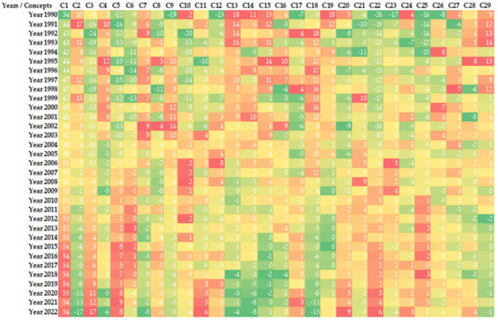 Figure 14 shows the heatmap based on the means of the importance weights of the concepts. From this figure, one can easily observe trending and de-trending concepts over the years. For example, it can be said that Concept 1 has a trend of increasing importance weight; by contrast, although it has second importance, Concept 2 is de-trending and now these issues are given less importance.