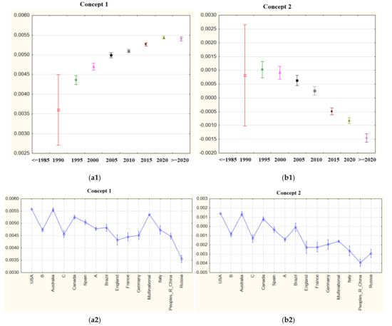 (a1) mean importance weights of Concept 1 for five-year periods; (b1) mean importance weights of Concept 2 for five-year periods; (a2) mean importance weights of Concept 1 via countries; (b2) mean importance weights of Concept 2 via countries.