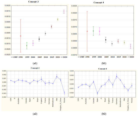 (a1) mean importance weights of Concept 3 for five-year periods; (b1) mean importance weights of Concept 4 for five-year periods; (a2) mean importance weights of Concept 3 via countries; (b2) mean importance weights of Concept 4 via countries.