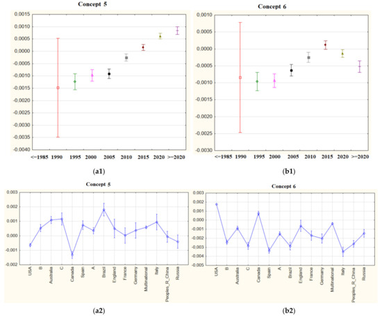 (a1) mean importance weights of Concept 5 for five-year periods; (b1) mean importance weights of Concept 6 for five-year periods; (a2) mean importance weights of Concept 5 via countries; (b2) mean importance weights of Concept 6 via countries.