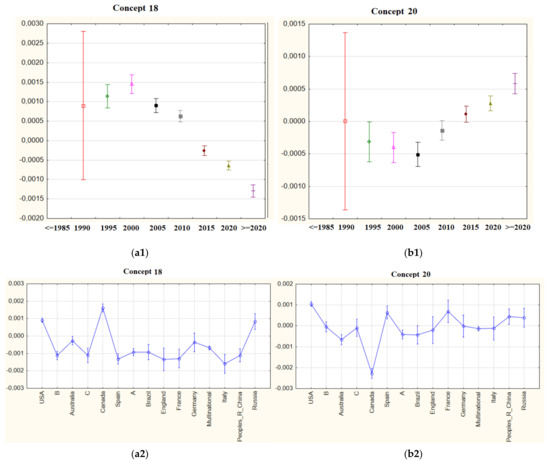 (a1) mean importance weights of Concept 18 for five-year periods; (b1) mean importance weights of Concept 20 for five-year periods; (a2) mean importance weights of Concept 18 via countries; (b2) mean importance weights of Concept 20 via countries.