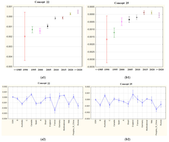 (a1) mean importance weights of Concept 22 for five-year periods; (b1) mean importance weights of Concept 25 for five-year periods; (a2) mean importance weights of Concept 22 via countries; (b2) mean importance weights of Concept 25 via countries.