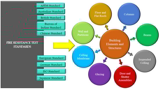 A fire-resistance test is a measure of load-bearing capacity, structural integrity, fire penetration, fire spread through heat transfer, and insulation. Existing standards recommend the requirements, acceptance criteria, and testing procedures for fire-resistance testing. Some of the fire-resistance test standards for building materials and structures adopted by different countries are shown in Figure 1. This section includes the objectives, setup description, experimental procedure, outcomes, merits, and demerits of the widely used fire-resistant testing standards specified by the regulatory bodies of different countries.