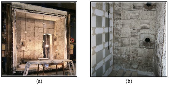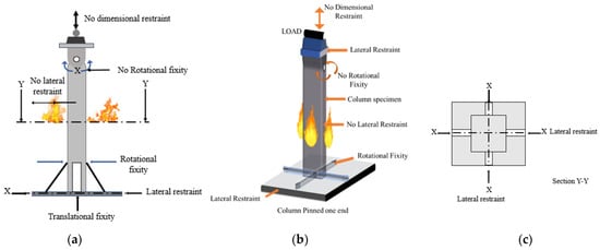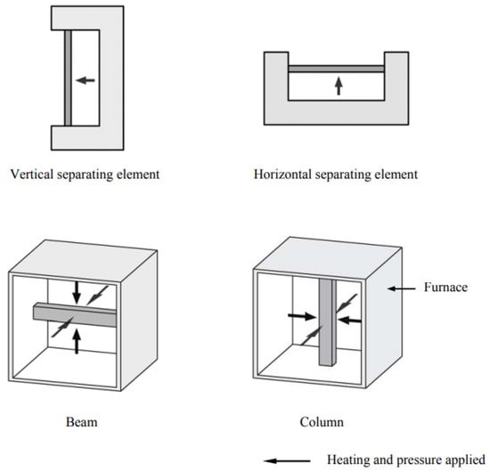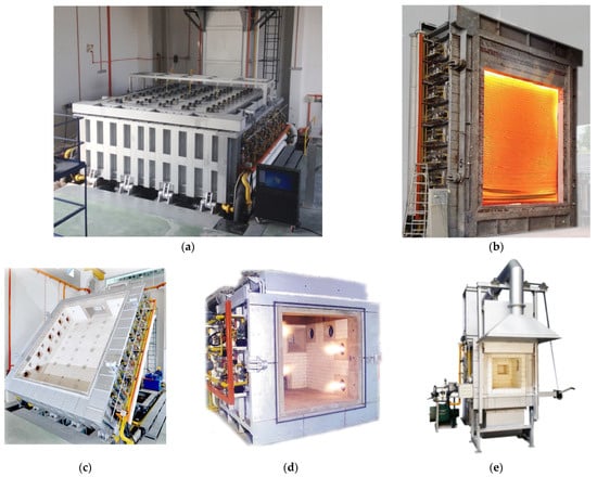 Furnaces are designed to evaluate the fire conditions and fire-resistance ratings of construction elements according to international standards. In general, there are horizontal, vertical, hydraulic tilting, indicative, and miniature fire-resistance test furnaces (Figure 2a–e) [22]. The horizontal furnace, as shown in Figure 2a, is used in the case of slabs, floors, roofs, and ceilings. In contrast, the vertical furnace, as shown in Figure 2b, is used in the case of walls, doors, columns, and partitions. The hydraulic tilting furnace (Figure 2c) is a dual-purpose furnace for fire-resistance tests on a slab, wall, ceiling, and beam in both vertical and horizontal positions. The indicative type of fire-resistance test furnace (Figure 2d) is useful to conduct tests for small samples and assemblies which are exposed to high temperatures. Similarly, the miniature fire-resistance-test furnaces (Figure 2e) are used to conduct fire tests on small vertical samples.