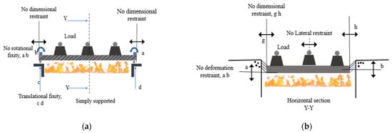 In BS 476, the load can be applied by using a hydraulic jack. The specimen support system should have sufficient rigidity and stiffness to restrain the boundaries or the ends of the test specimen, considering thermal deformations and applied loads. Fixed-surface, either type T or type K, thermocouple wires with a maximum diameter of 0.5 mm should be used. A radiometer should be used to measure irradiance within a range of 0 to 100 kW/m2. For measuring the internal temperature of the specimen, internal thermocouples should be used. Figure 5 represents the restraints applied on the specimen in a vertical furnace to measure the fire resistance of a load-bearing wall. Figure 5a shows a 2D representation of a fire-resistance testing on loaded wall. The wall experiences one-sided fire exposure during the test, as depicted in Figure 5b. It can be seen in Figure 5 that a translational fixity is provided at the bottom side. However, there is no dimensional restraint provided on the wall specimen itself to allow the specimen to swell up during fire exposure. Figure 6 shows the different views of dimensional restraint applied on a non-load-bearing wall during the fire-resistance testing. Figure 7 demonstrates the arrangement for the fire testing of floor specimens. The supports restraining the edges of the test specimen shall have sufficient stiffness and rigidity to resist forces exerted by any thermal movement induced during the test and should represent the real service conditions. The floor specimen is placed in the horizontal fire furnace, and the specified loads are applied. The specimen is then exposed to fire from the underside to test its load-bearing capacity, insulation, and integrity. Figure 8 shows the arrangement for the fire testing of column specimens. In this arrangement, the column is protected from lateral deformation at its top and fixed at its bottom. The specified load is applied to the column while exposing the column to fire from four sides. The load bearing, insulation, and integrity are measured in terms of duration causing failure to the considered criterion. Figure 9 demonstrates the test setup for the fire-resistance testing of a beam specimen. The specimen is not restrained in the torsional and lateral directions. Tests generally start by measuring the ambient temperature and applying constant specified loads. Then the specimen is heated in the furnace at controlled temperature and pressure conditions. The temperature–time heating regime should follow Equation (2). For assessment of structures that contain fuels including petrochemicals, the standard hydrocarbon curve, given by Equation (3), should be followed. The mean furnace temperature is measured by thermocouples, which can be either bare nickel chromium/nickel aluminum wire with a diameter of 0.75 to 1.5 mm or nickel chromium/nickel aluminum mineral insulated thermocouple. It is recommended that the thermocouple hot junctions should be arranged at 50 to 150 mm from the surface of the specimen to avoid any damage. The percentage deviation (ρ), Equation (4), between the mean furnace time–temperature curve and the standard time–temperature curve should not exceed 15% at fire duration of 10 min, 10% for fire duration from 10 to 30 min, and 5% for fire duration from 30 min to the termination of the heating period. Moreover, starting with a fire duration of 10 min, the temperature rise in any of the furnace thermocouples should not differ from the standard fire temperature by more than 100 °C. This temperature difference is allowed to reach 200 °C for a construction with combustible material. Regarding the furnace pressure, a positive pressure needs to be established for a duration of 5 min. The pressure gradient within the furnace must not exceed 20 Pa. Deflection of the specimen is monitored and recorded. A radiometer is used to measure the radiation flux emitted from the unexposed face.
