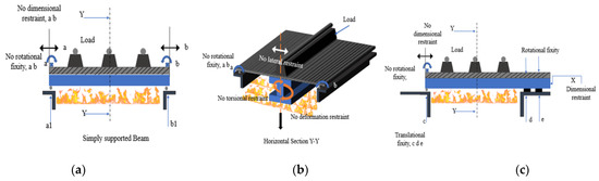 Restraints for beams: (a) 2D, (b) section, and (c) beam fixed at one end.