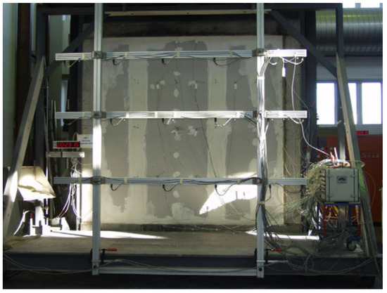 Nassif et al. presented the experimental observations and outcomes of a full-scale fire-resistance test on a partition wall. The partition wall was built within a concrete frame and exposed to the standard fire test. The partition wall was made with C-section steel studs, with gypsum boards fixed on both sides, and the wall craters were filled with rock wool insulation. It was observed that the full-scale fire-resistance test gives detailed thermal profiling throughout the partition wall. The setup for the large-scale fire-resistance test of the partition wall utilized in the study is shown in Figure 20 [55].