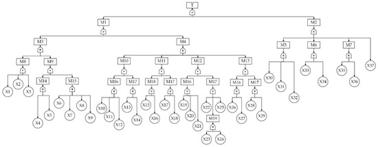 Risk discrimination is the main step in risk management, and also the premise and basis of risk avoidance. The research on the influencing factors of coal-mine safety production is mostly analyzed from four perspectives: human, machine, environment and management [14]. Because safety-management factors include safety organization systems, safety rules and regulations, safety training and education and many other factors, they is difficult to extract and quantify, and they also interact with the human–machine environment and other risk factors. Therefore, this article mainly analyzes the risk factors from three perspectives: human, machine and environment. This research analyzes 100 classic cases of coal-seam fire accidents in China from 2000 to 2022, and these public data are commonly from the National Mine Safety Production Supervision Administration, the Coal Mine Safety Production Network, and the provincial and municipal coal-mine safety-production-supervision bureaus. The accident distribution is shown by using 37 of the coal-seam fire factors (Figure 1). Taking these 37 relevant factors as the basic events, the fault-tree modeling is developed in accordance with the disaster chain of coal-seam fire accidents, as shown in Figure 2. The meaning of each event in the fault tree is shown in Table 1.