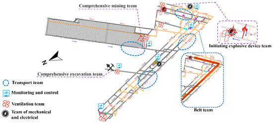 The occurrence of a coal-mine fire is closely related to the geological conditions of coal seams, the development and mining conditions, ventilation conditions, disaster-relief systems, and so on, which involve numerous working positions in coal mining [15]. At present, there is no specific classification standard for coal-mine posts [6]. Therefore, by describing accident cases and analyzing the main safety management processes of coal-mining enterprises in Hebei, Henan, Shanxi, Inner Mongolia Autonomous Region, Xinjiang and other regions in China, this research summarizes five teams related to 37 factors and 24 job positions, as well as the relevant factors contained in each working position (Table 2). These five teams mainly include the comprehensive mining team, the comprehensive excavation team, the electromechanical transportation team, the ventilation team and the safety-supervision department. The results show that the main coal miners in the comprehensive mining team and the underground-electrical-maintenance workers in the mechanical and electrical transport-team suffered from the most factors, followed by the filling workers in the fully mechanized mining-team, the blasting workers in the fully mechanized mining-team and the electric welders in the mechanical and electrical transport-team. ArcGIS software was used to mark the coordinate positions of each working position on the map, in accordance with the actual distribution of the mining area. The working-position distribution is shown in Figure 3.