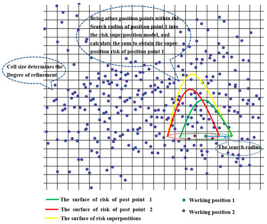 The process of calculating the superimposed risk of job points is shown in Figure 4. Firstly, the working-position points are covered on the fenced research area. Each working-position point is covered with a risk curved suface, and the risk surface at the location of the point takes the highest value (risk value). Within the search radius of a working-position point, other position points are brought within this radius in the risk superposition model, and then the sum is calculated, to calculate the superposition risk of the position point.