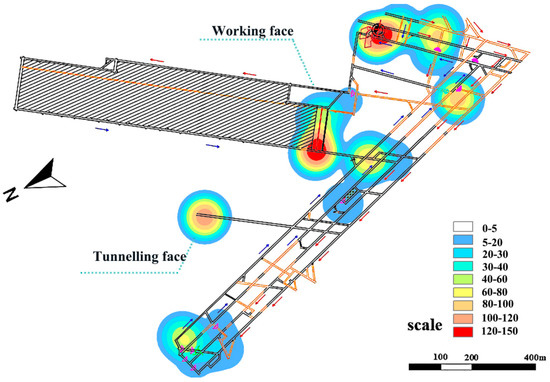 The risk-distribution map of fire-risk accidents is shown in Figure 5. The depth of color reflects the size of the regional risk value: the more intensive the position, the greater the risk-impact range, which shows directly the specific distribution of post-personnel risk. We can see intuitively that the stations with risks greater than 100, that is, the level 1 stations, are at the coal-mining face, the shaft and the tunneling face. Among them, the posts at the coal-mining face and the tunneling face are densely distributed, and are prone to fire, due to mining, maintenance, stress and other reasons, and the risk value is high; There are many posts involved in the shaft, which has a great impact on ventilation. The consequences of fire are extremely serious, and the risk value is high. The inlet and return airways involve ventilation workers, winch drivers, tape-conveyor drivers and other positions, and the risk value is more than 80. In the actual coal-mine-production process, these areas are also coal mine fire-prone areas.