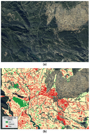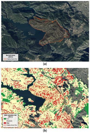 The fine-scale patterns in fire behaviour are important from a risk standpoint and can be assessed using a number of innovative approaches developed in recent decades for estimating and mapping wildfire risk and exposure [37,42,49,50,51,52]. These approaches use quantitative wildfire risk assessment [51] and employ a number of relatively new, large, fire modelling systems. Nevertheless, there are no studies assessing greenhouse gas emission risk from a preventive perspective with the aim of managing it to reduce emission risk impacts on the climate from forest fires. Therefore, the general objective of this study is to set the basis for a qualitative spatial assessment of forest fire emissions risk.