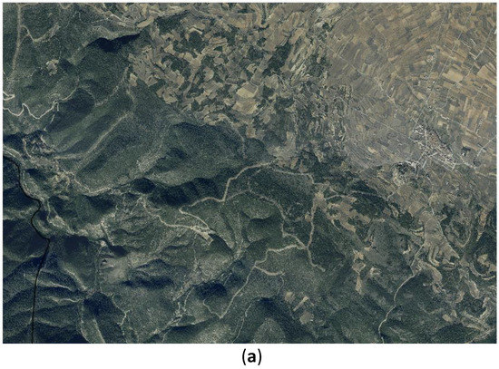 Firebreaks are defined as strips or elongated spaces with a width of 20 to 30 m in which all types of vegetation are removed, exposing mineral soil [72], while fuelbreaks have a biomass decrease associated with a fuel model change. Both nets are constructed on artificial lines, such as paths, boundaries of mountains or forest planning units; on natural lines such as maximum line slopes coinciding with the separation of rain gaps; and on summit lines, although in this case, they should be located not on the hills but rather in areas set back above the beginning of the slopes, where the wind speed is relatively low [69,72]. They have a double objective of acting as a barrier for the propagation of the fire and as a physical support for firefighters and extinction media to perform their work.