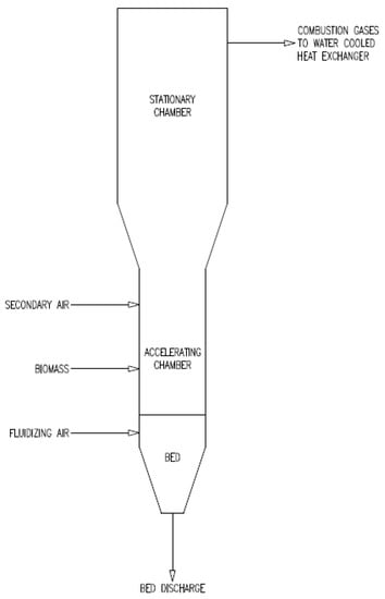 The heat exchanger was positioned downstream the oxidating chamber and produced approximately 500 kWt. Thermal power is provided to the user through the superheating of the water. The two combustion chambers (accelerating and stationary flue gas) are connected as represented.
