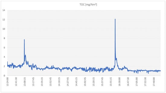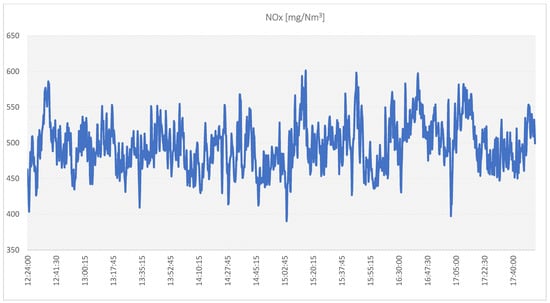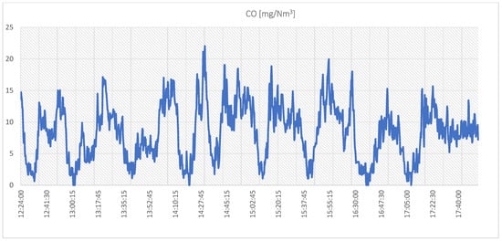Biomass burning is responsible for atmospheric emission generation and great inorganic residues production, distributed between the gaseous and solid fraction [56]. Gas emission concentrations obtained during the six hours of sampling are shown in Table 6, and relative trend emission flow is shown in Figure 3, Figure 4, Figure 5 and Figure 6. The results expressed in mg/Nm3 are compared with an oxygen content of 11% in compliance with the Legislative Decree 183/17.