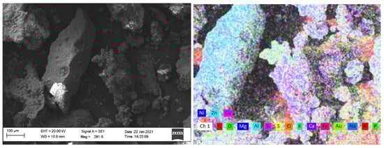 The bag filter effect is evident. This abatement system effectively retains the PM generated with better results for larger fractions. The TSP are slightly above the legislative limits, and this is probably due to the high ash content of the incoming matrix. Figure 7 shows SEM image of the sampled PM. There are different morphologies and amorphous structures that incorporate more defined crystalline structures.