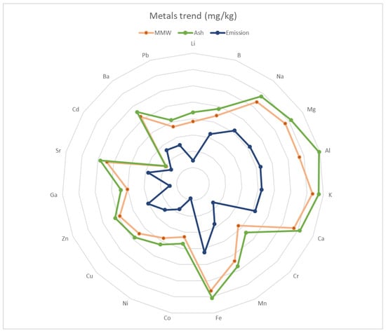 The graph in Figure 9 highlights a trend of metals and some elements seem to share the same behaviour following a trend that could define them as more or less volatile. For example, from the results about metal content in the previous tables, the emissions have high values of Na, Al, K, Mg, and Ca, which come from the biomass, while Fe, Ni, Cr and Cd come from the combustion bed and are found in the ashes. Therefore, we can deduce that some elements by their nature tend to go into emission, while those tend to go into ashes. Observing the profile of the graph in its entirety produced by the union of points, it is observed that some elements (Li, Cr, Co, and Ga) have low emission concentrations with respect to their ash content and in the input biomass. In fact, in the emission profile (blue line Figure 9) there are more marked concavities for these elements.