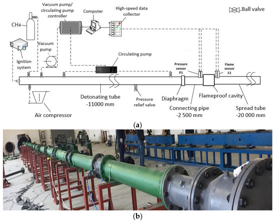 A highly explosive experimental apparatus with a self-built pipe of 36,000 mm long and 200 mm in diameter was used. The testing system comprises the gas distribution, piping, igniting, and data-collecting subsystems. Figure 1a displays the practical system’s schematic diagram, and Figure 1b shows the system’s photographs. The pipe subsystem comprises a steel pipe with a 200 mm inner diameter and a 10 mm wall thickness that is separated into a detonation pipe, connecting pipe, and propagation pipe. The propagation tube is 20,000 mm long, the connection tube is 2000 mm, and the detonation tube is 11,000 mm long. The air compressor, vacuum pump, methane gas cylinder, circulation pump, and electronic pressure gauge comprise the bulk of the gas distribution subsystem. The major components of the ignition subsystem are the electrode, power source, electric fuse, and ignition controller. Most of the data collection system members are pressure sensors, high-speed data-gathering equipment, and data processing software. For the trials, 99.9% pure high-quality methane gas was employed. The pressure sensor range is 0–3 MPa, the accuracy level is 0.5% FS, and the ignition energy may be up to 10 J. In the explosive tube, methane and air are combined, and a diaphragm cuts off the connecting line.