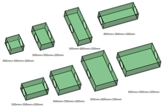 According to the construction and support specifications, the explosion chamber’s length and breadth should not exceed four times the roadway’s diameter. As a result, the length, width, and height of this experiment were custom-made for explosion chambers in the following sizes: 300 mm × 300 mm × 200 mm (3–3), 300 mm × 500 mm × 200 mm (3–5), 300 mm × 800 mm × 200 mm (3–8), 500 mm × 300 mm × 200 mm (5–3), 500 mm × 500 mm × 200 mm (5–5), 800 mm × 300 mm × 200 mm (8–3), 800 mm × 500 mm × 200 mm (8–5), and eight other sizes. To increase the viability of the numerical simulations, experimental investigations were used to validate them, and based on these studies, more research was conducted. Figure 2 depicts the explosion chamber model’s schematic diagram, while Figure 3 depicts the chamber.