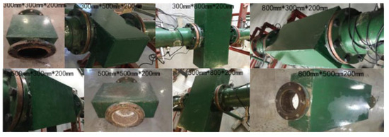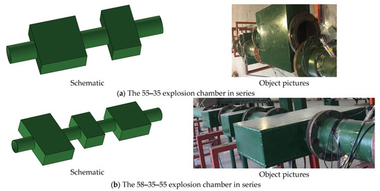 Existing research suggests that the explosion chamber construction may contribute in some way to eliminating shock waves. To increase the wave attenuation efficiency, we must undertake an experimental study on the wave attenuation impact of several explosion chambers in series. The series explosion chamber test is an exploratory test due to the constraints of the test environment. The restricted number of explosion chamber models led to the selection of various-sized explosion chamber combinations for experimental testing. The explosion chamber structures with dimensions of 500 mm × 500 mm × 200 mm and 500 mm × 800 mm × 200 mm have apparent effects on reducing the shock wave of a methane explosion, and 300 mm × 500 mm × 200 mm have sound effects on lowering the explosion flame velocity, according to the previous research findings of our research group [5]. As a result, experiments using multiple explosion chamber series 55–35 and 58–35–55 were carried out. Figure 4 displays the schematic design and images of the multi-stage series explosion chamber test.