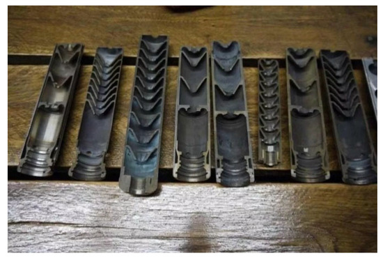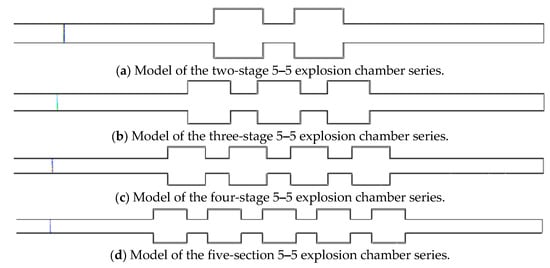 Multi-stage explosion chambers were designed in sequence and based on the 5–5 (500 mm × 500 mm × 200 mm) explosion chamber, as illustrated in Figure 6. Tandem explosion chamber versions with two, three, four, and five stages each were constructed.