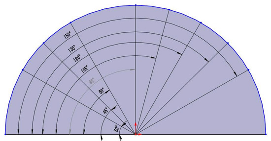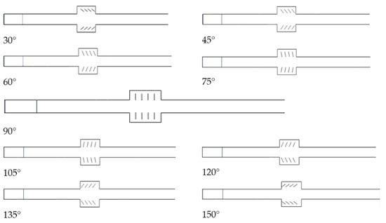 Existing human defense project space is constrained, making it challenging to build numerous explosion chambers, which means only current explosion chambers can be improved. To increase the protection potential of human defense projects, it is crucial to optimize the design of the wave dissipation impact of a single-stage explosion chamber and increase the wave dissipation capacity of a single-stage explosion chamber. Figure 7 depicts the gun’s silencer construction. The wave elimination plate and the silencer structure’s changing cross-section can potentially damper acoustic waves. As a result of quick pressure changes, shock waves are pulsed sound waves from an aerodynamic standpoint. Therefore, silencers are excellent at reducing sound waves. This paper attempts to construct a wave dissipation plate similar to the design of the silencer in the explosion chamber, drawing inspiration from the “silencer” structure of the gun. By varying the angle of the plate, it aims to determine the ideal angle of the wave dissipation effect, and thus make it easier to transform the explosion chamber currently used for the human defense project. Nine distinct explosion chamber models with wave elimination plate angles of 30°, 45°, 60°, 75°, 90°, 105°, 120°, 135°, and 150° were constructed; the angles are represented schematically in Figure 8 and the models are explained in Figure 9.